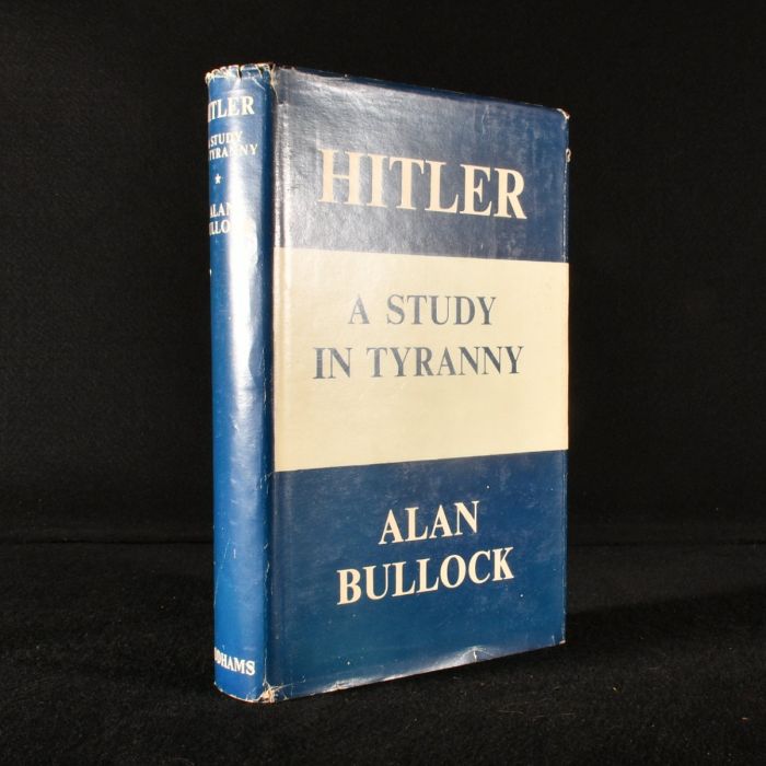 A 1952 first edition of the first-ever complete biography of Adolf Hitler, from birth to death. Alan Bullock's first comprehensive biography of Adolph Hitler, based partly on transcripts of the Nuremberg trials, and published only shortly after WWII. A first edition complete with a frontispiece and 8 photographic pages. In the original unclipped dustwrapper. The first edition, first impression, with no further impressions stated.
